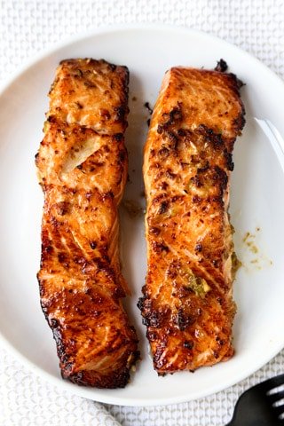 Marinados en una salsa simple de ajo y jengibre, estos filetes de salmón son crujientes por fuera y perfectamente húmedos por dentro.