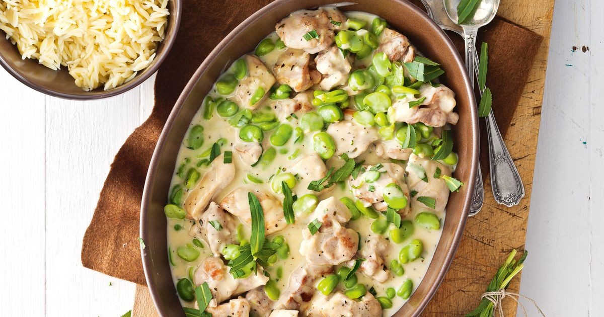 Agregue la crema y los frijoles a la mezcla de pollo. Cocine por 3 minutos o hasta que se caliente por completo. Añadir estragón fresco. Condimentar con sal y pimienta. Servir con arroz integral.