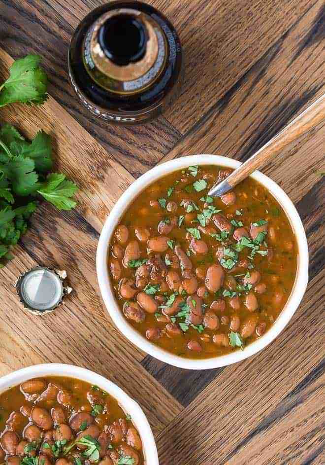 Sirve los frijoles borrachos en un tazón con una cuchara para que todos puedan obtener toda esa rica jugosidad.