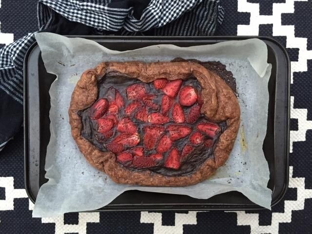 Relleno: Verter la crema de chocolate en el centro de la galette y extender, dejando unos 3 cm del borde. Coloca las fresas encima. Si lo desea, ralle un poco de chocolate negro antes de hornear.