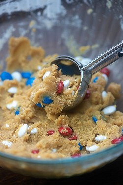 Galletas de chispas de chocolate con mantequilla de maní cruda: ¡Agregue unas gotas de rojo, blanco y azul!