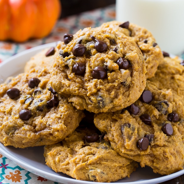 Estas galletas de calabaza con chispas de chocolate tienen una textura suave y están aromatizadas con canela, nuez moscada y jengibre.