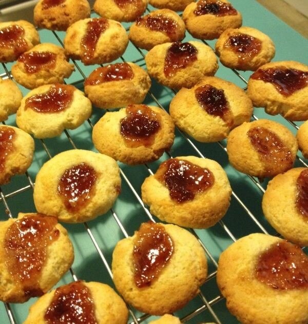 Combine todos los ingredientes excepto la mermelada de fresa, mezcle para crear una masa suave y húmeda.