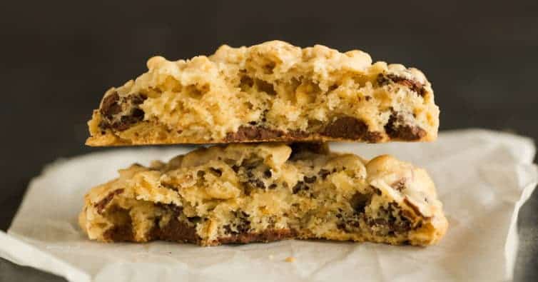 Estas galletas son muy similares a mis galletas favoritas de avena y pasas, pero omití las especias, agregué un poco de vainilla y agregué las chispas de chocolate. Puede hacer que estas galletas sean más pequeñas o más grandes según sus preferencias personales, asegúrese de ajustar el tiempo de cocción en consecuencia. Sabes que me encantan las galletas grandes, así que a menudo las hago más grandes que dos cucharadas seguidas.