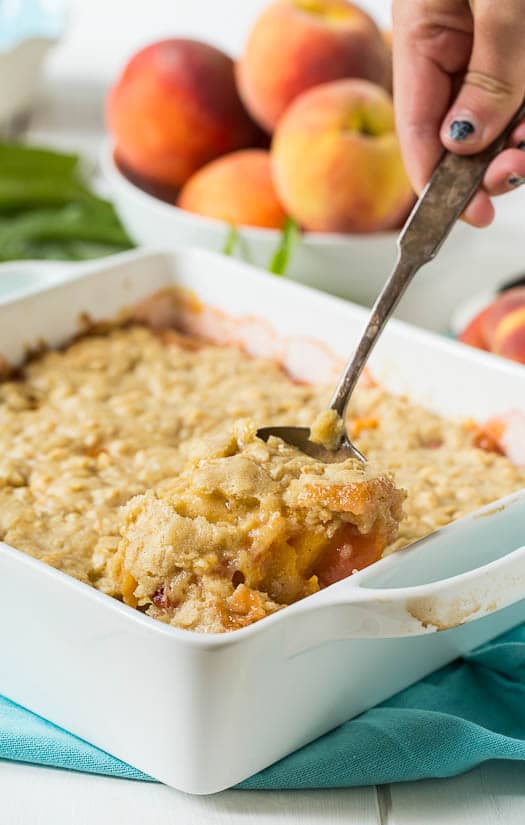 Una deliciosa tarta de durazno con un topping que sabe a galletas de avena. Hecho con duraznos frescos, es un maravilloso postre de verano.
