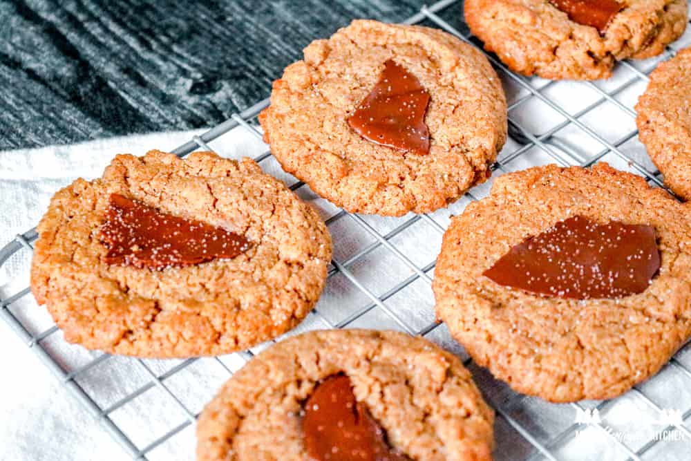 Como estas galletas no contienen harina, debes vigilarlas mientras se hornean. Pasarán de quemado a quemado en un abrir y cerrar de ojos. Así que siempre use esta receta como una guía aproximada. Todos los hornos cocinan de manera ligeramente diferente, así que vigile sus galletas.