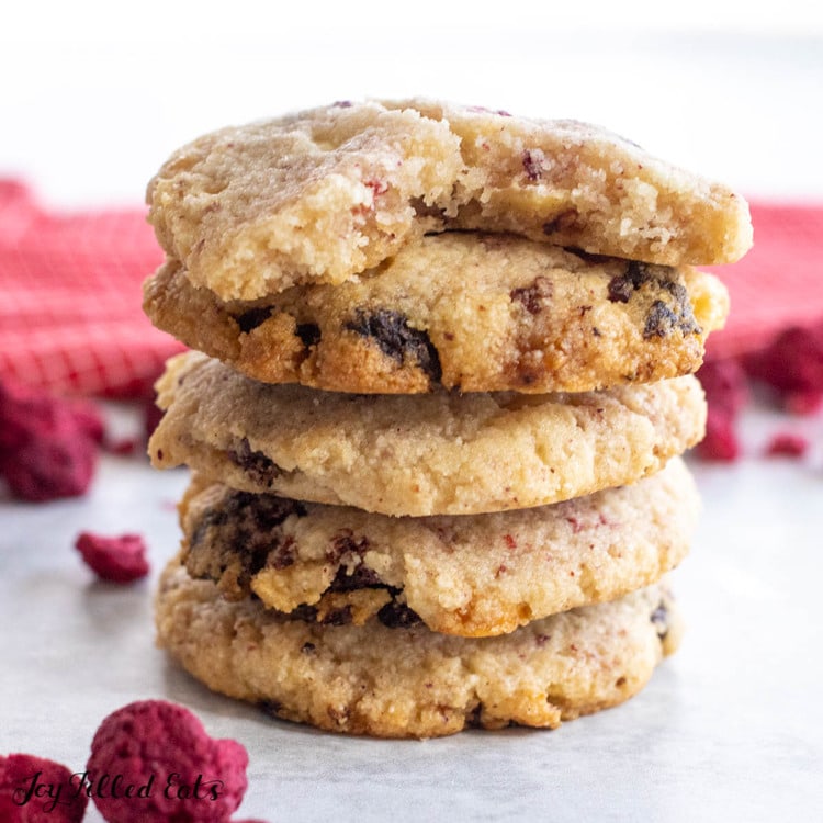 frambuesas liofilizadas – Estos son un poco amargos, pero combinan bien con los otros ingredientes. Las frambuesas frescas o congeladas están demasiado húmedas para usarlas en estas galletas.