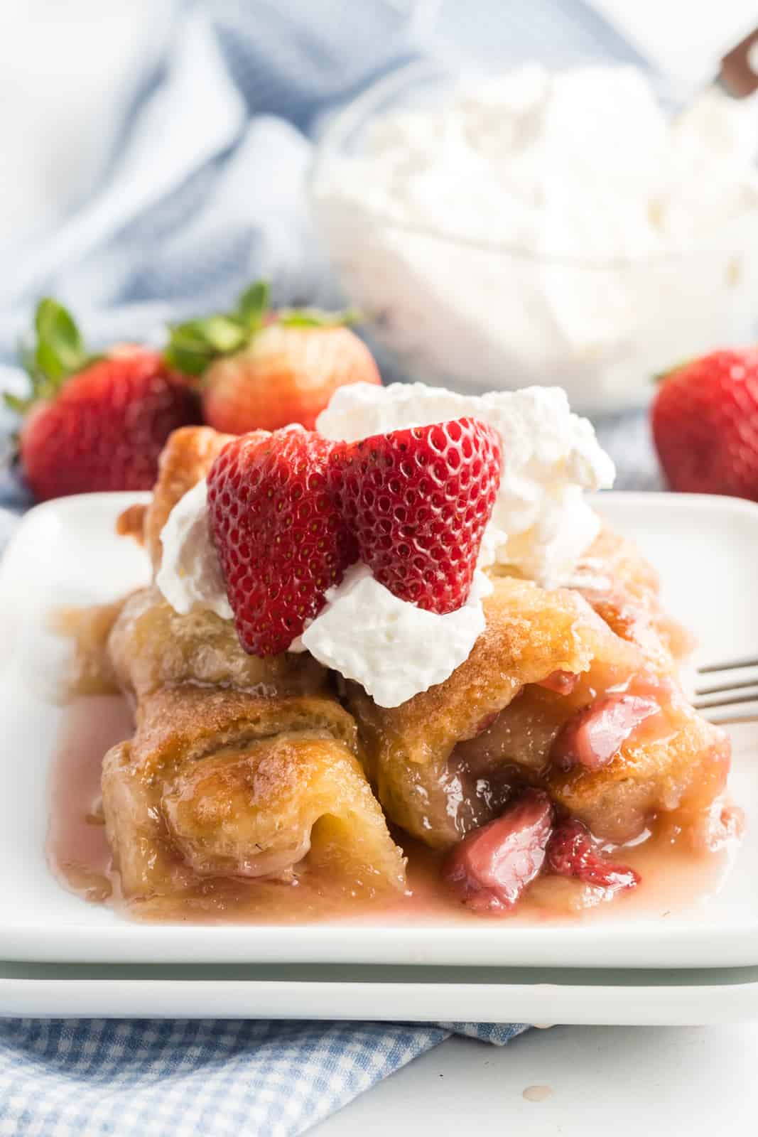 Nos encanta cubrir esto con crema batida casera fresca, le da una textura ligera y agradable a la receta de drenaje en sí. Piense en ello como un pastel de fresa más pesado.