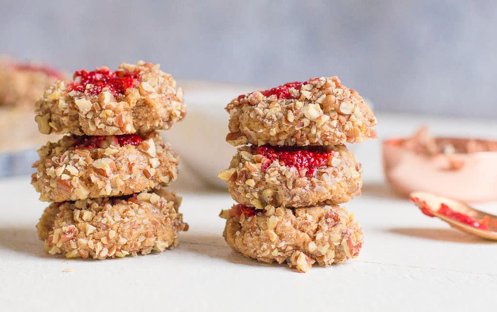 ¡Las galletas Paleo Thumbprint están cubiertas con nueces y rellenas con deliciosa mermelada de frambuesa! Esta clásica galleta navideña es tan deliciosa, pero también sin granos y refinada sin azúcar, ¡lo que la convierte en una opción más saludable!