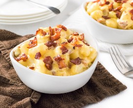 Macarrones con ñoquis y queso con tocino