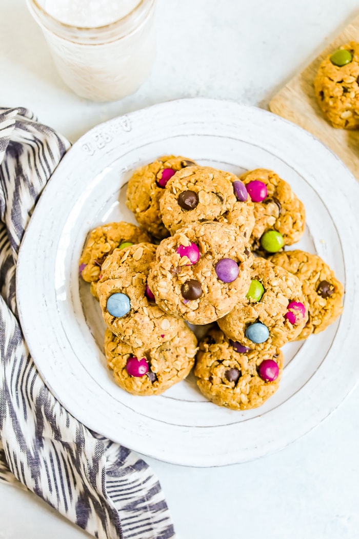 A Isaac le encanta la mezcla de monstruos de senderos y, desde que me quedé embarazada, ¡también me atraparon! Durante mi primer trimestre, escondía puñados cada vez que pasaba por la cocina… buscando estratégicamente el puñado con más M&M. Mi nuevo amor por Monster Trail Mix inspiró esto receta de galletas monstruosas, Pero, sinceramente, me sorprende que nunca antes haya compartido una receta de galletas como esta, porque combinan todos mis ingredientes dulces favoritos: avena, mantequilla de maní y chocolate.