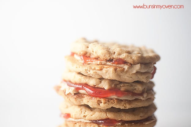 Sé que las galletas de mantequilla de maní y mermelada probablemente fueron hechas hasta la saciedad, pero no me importa y no puedes interesarme, así que eso es todo. Estas son deliciosas galletas de avena con mantequilla de maní, ligeramente crujientes, rellenas con mantequilla de maní y mermelada.