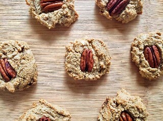 - Coloque aproximadamente 1 1/2 cucharadas de bolas del tamaño de una bandeja para hornear engrasada. Aplanar y cubrir con una nuez.