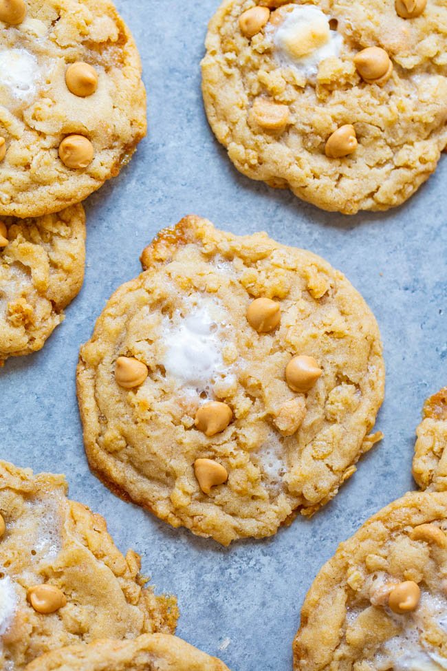 Las galletas Fluffernutter no solo tienen malvaviscos y chips de mantequilla de maní, sino también cereal de arroz crujiente. El cereal agrega una textura increíble a las galletas que amo.