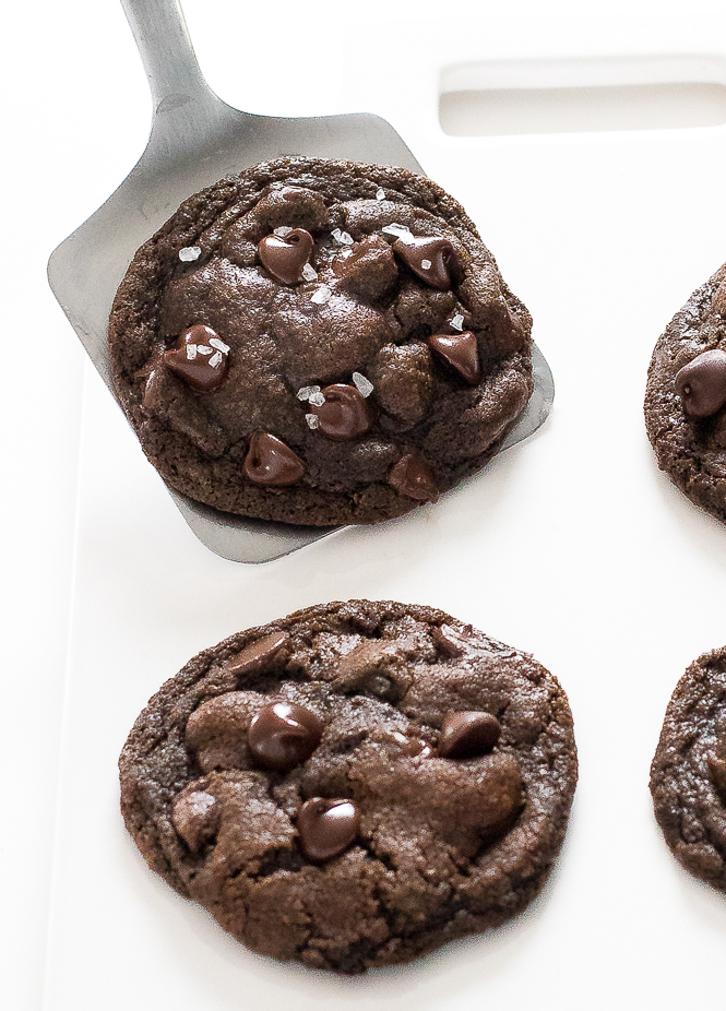 Galletas de aceite de coco de chocolate doble perfectamente suaves y masticables. ¡Cargado con chispas de chocolate y espolvoreado con sal marina!