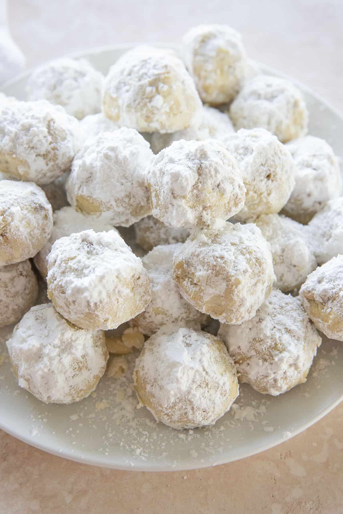 ¡Estas galletas de bola de nieve también se llaman galletas de boda mexicanas o pasteles de té rusos! Son más o menos lo mismo y la receta ha existido durante años. Una galleta clásica, muy parecida a la mía. Galletas navideñas espolvoreadas, estos siempre aparecen durante las vacaciones! Si bien cada uno puede tener su propia interpretación o método para hacerlos, ¡tienen ingredientes súper simples! ¡Todo lo que necesita es mantequilla, sal, extracto de vainilla, harina, nueces si lo desea y azúcar en polvo! La masa se desmorona un poco, pero puedes apretarla fácilmente con las manos y formar bolas, se mantienen juntas perfectamente durante la cocción.