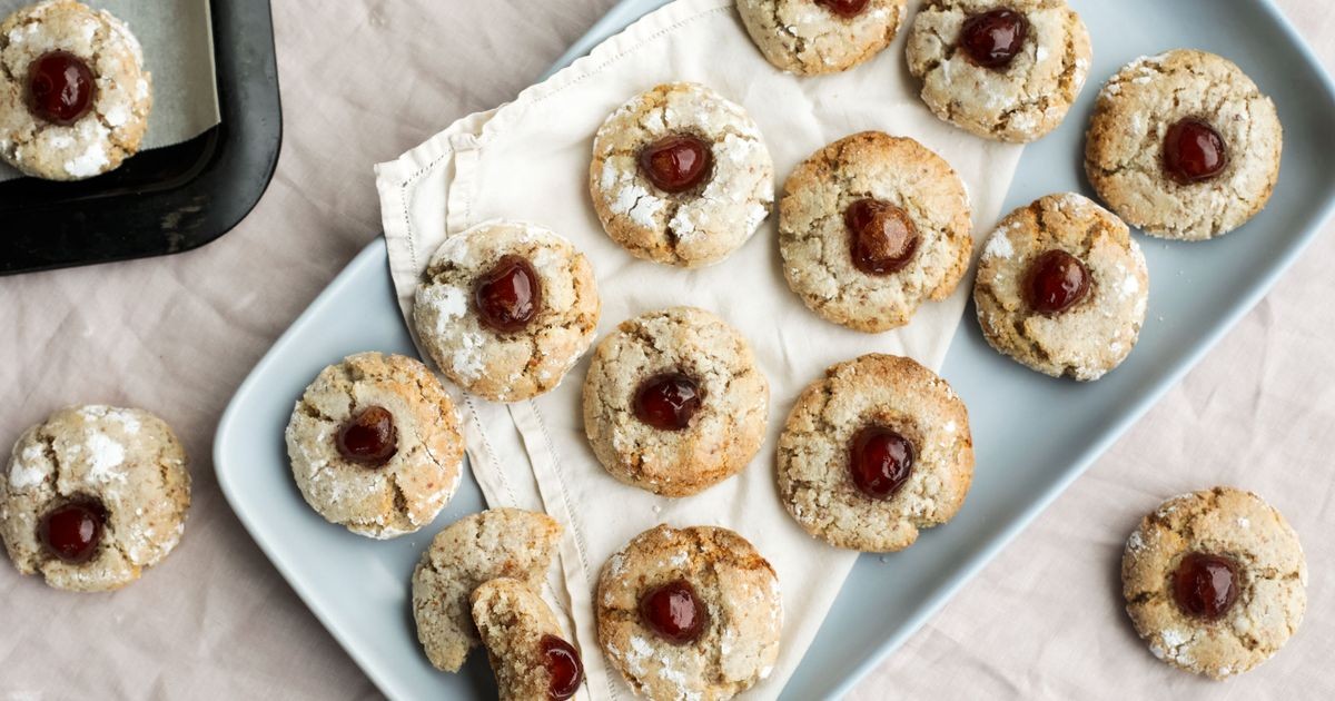 Yo uso almendras blancas molidas. Puede congelar estas galletas durante 3 meses descongelándolas durante unas horas antes de servirlas. Puedes reemplazar la cereza encima por ½ almendra o almendras fileteadas. No cocine durante más de 10 minutos: gire la sartén después de los primeros 5 minutos y luego otros 3-5 minutos. No deben dorarse, ya que si se cocinan demasiado, se endurecerán. Deben quedar ligeramente crujientes por fuera y muy húmedos por dentro.