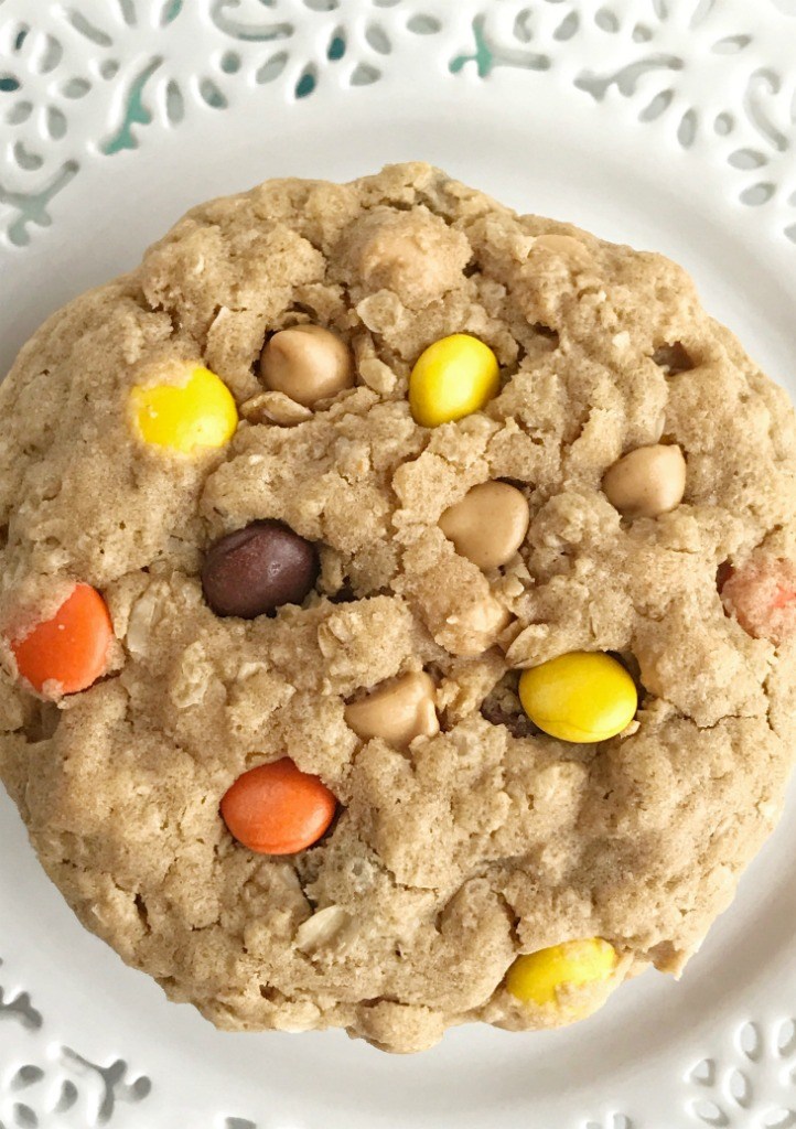 Galletas monstruosas de mantequilla de maní triple Son tan espesos, masticables, horneados y cargados con mantequilla de maní. Mantequilla de maní cremosa, avena, hojuelas de mantequilla de maní y dulces de Reese’s Pieces.