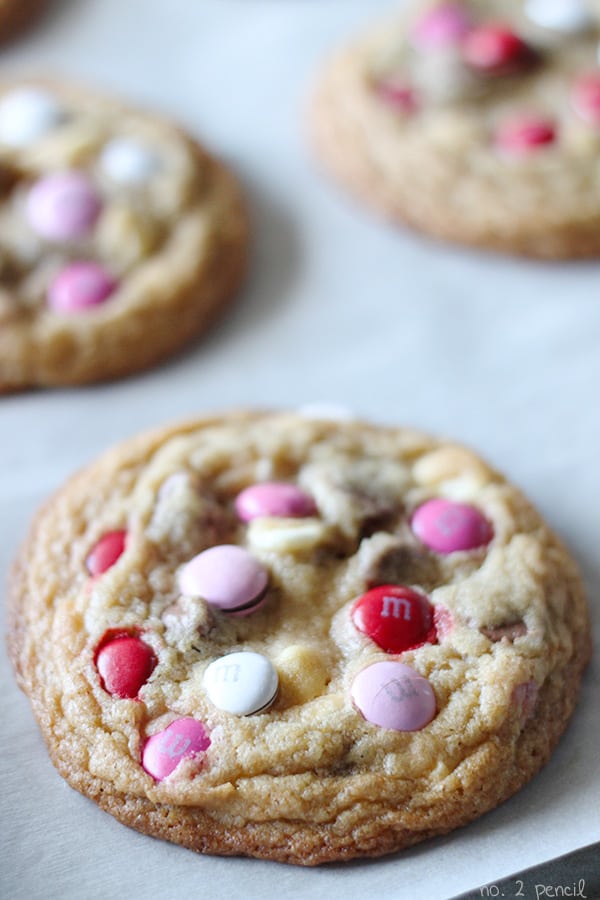Estas galletas son las galletas M&M perfectas. Están cargados de hojuelas de chocolate con leche, hojuelas de chocolate blanco y M&M. Comencé con Perfect Chocolate Chip Cookie Dough y agregué una combinación de hojuelas de chocolate con leche y hojuelas de chocolate blanco junto con M&M. Las chispas de chocolate blanco no quedan tan suaves y esponjosas como las chispas de chocolate con leche, así que tienes tres texturas diferentes en estas galletas M&M. Copos de chocolate blanco dulce que conservan su hermosa forma, los copos de chocolate con leche suaves, suaves y ligeramente crujientes de M&M. Estas galletas M&M también son grandes y lindas. ¡Perfecto como regalo o regalo de vacaciones! Usé M&M’s de San Valentín, ¡pero estos se verían geniales con cualquier color!