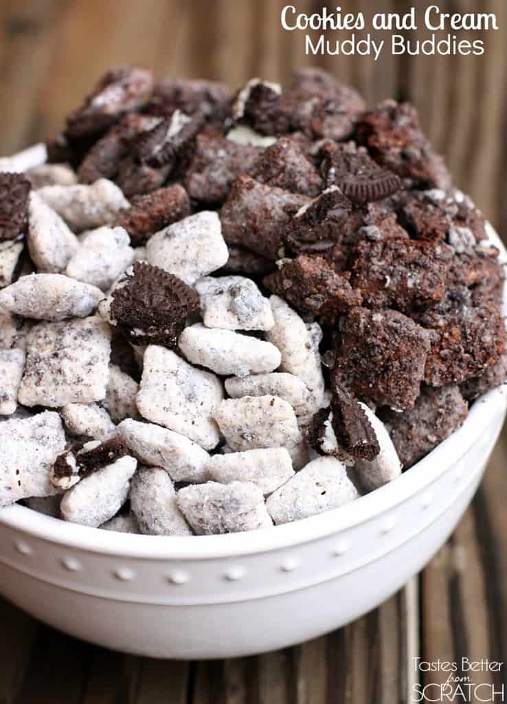 Cookies and Cream Muddy Buddies son cereales Chex mezclados con copos de chocolate blanco y con leche, oreo y azúcar en polvo.