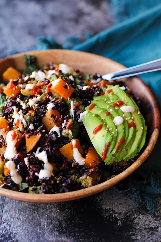 Sirva con rodajas de aguacate, semillas de sésamo, crema de marañón y sriracha.
