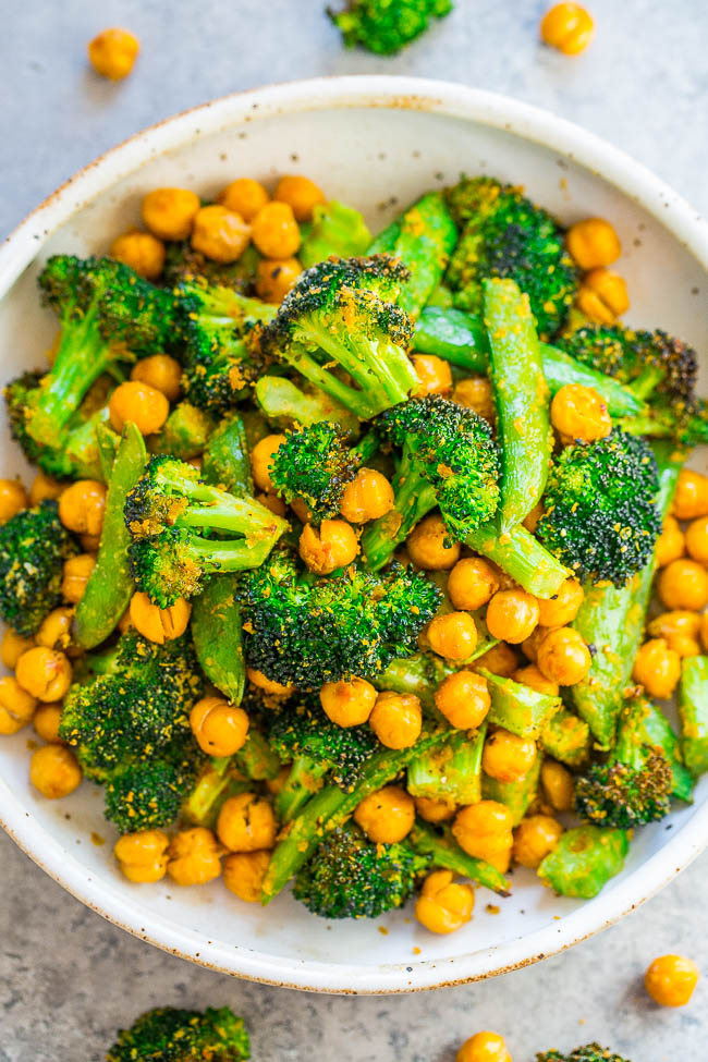 Garbanzos asados con queso y brócoli – ¡Rápido, FÁCIL, saludable y te mantiene lleno y satisfecho! ¡Vegano y sin gluten no tiene por qué ser aburrido! ¡Almuerzo perfecto, guarnición o plato principal sin carne! ¡¡Te encantará el toque de queso!!