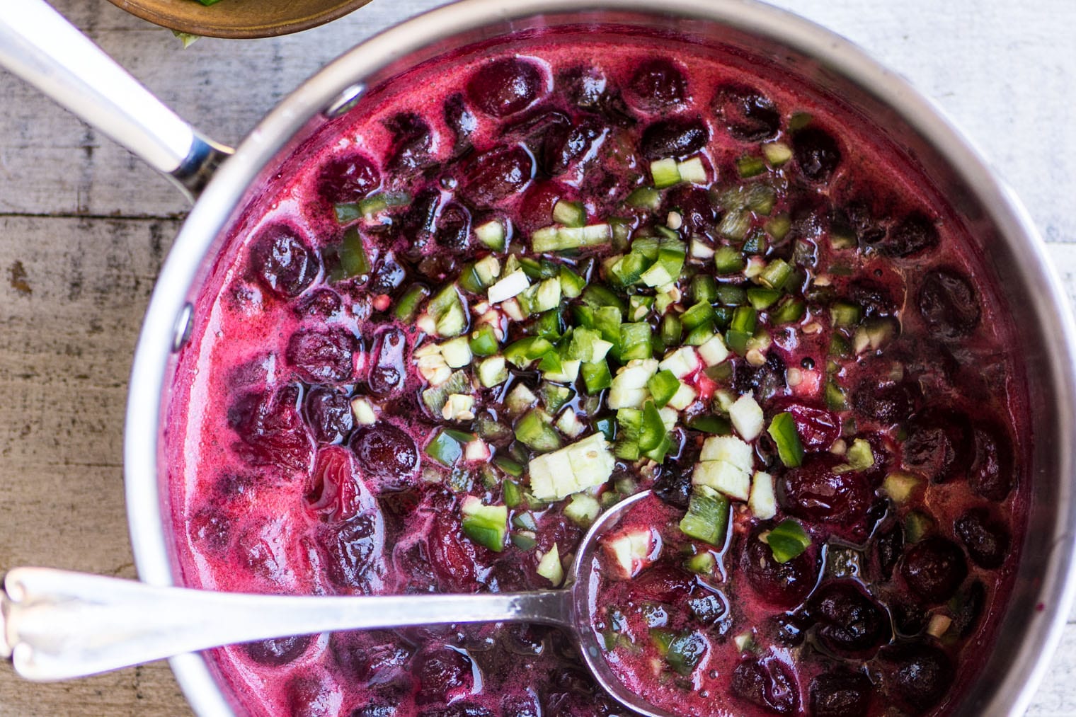 Sin embargo, este es para adultos; Cubra con chile jalapeño fresco y una pizca de vinagre. El chile y los arándanos son una de esas combinaciones inesperadas que funcionan, el sabor agridulce de los arándanos puede soportar el picor de los pimientos y los dos juntos hacen un gran festín en la boca. Palabra de advertencia: ¡asegúrese de advertir a las personas antes de dejarlo en la mesa de Acción de Gracias!