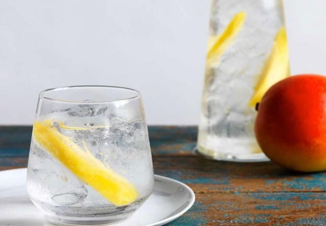 Coloca los cubitos de hielo en un vaso alto, vierte la ginebra, luego la tónica y agrega 2 piezas de mango a cada bebida.