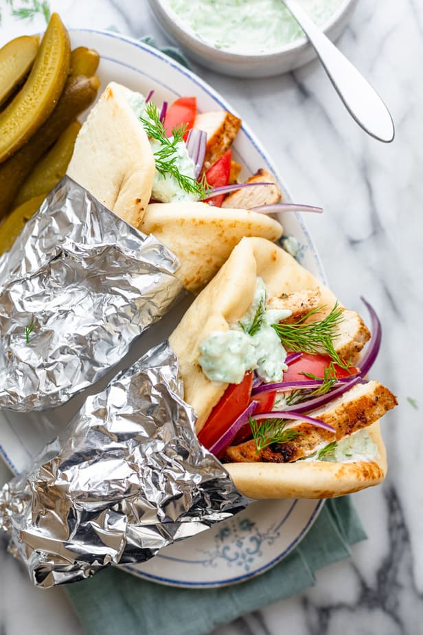 Y ahora está listo para servir los giroscopios de pollo a la parrilla en una pita (utilicé un panecillo naan según la disponibilidad) con verduras frescas y salsa tzatziki si lo desea.