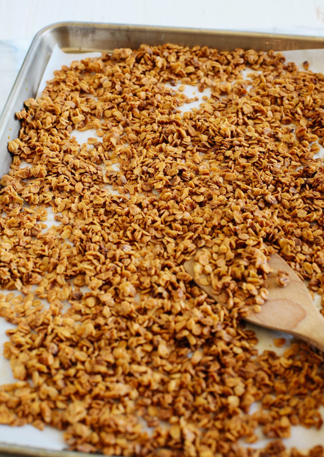 Esta receta requiere solo tres ingredientes simples, y probablemente sean elementos que probablemente ya tenga en su despensa. También me gusta agregar un poco de canela y extracto de vainilla para endulzar las cosas, pero esta receta básica es correcta. copos de avena + aceite de coco + jarabe de arce. Auge HECHO. También agregaré nueces, semillas o arándanos de vez en cuando solo para cambiar las cosas, pero siéntase libre de hacer esta receta suya y de su gusto. ¡Te prometo que literalmente no podrías arruinarlo si lo intentaras! Solo asegúrese de mezclar la granola por la mitad mientras se cocina para que se cocine bien y de manera uniforme.