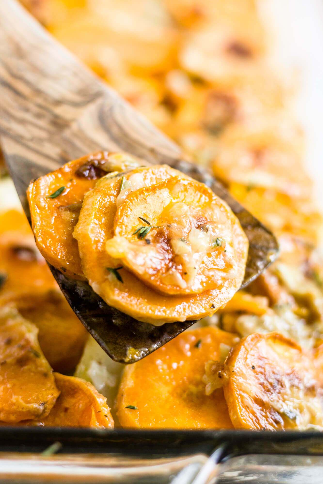 ¡Esta receta de batatas gratinadas será una estrella en tu mesa de Acción de Gracias! No contiene lácteos, es vegano, paleo y no te perderás NINGÚN sabor. Está cargado de ajo, hierbas y una salsa cremosa que a todos les encantará. ¡Obtenga esta receta de cazuela saludable lo antes posible!