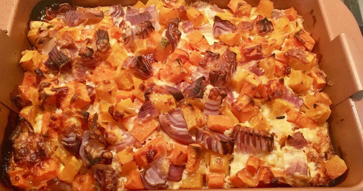 Coloque una capa de calabaza, camote, tocino y cebollín en una bandeja para hornear.