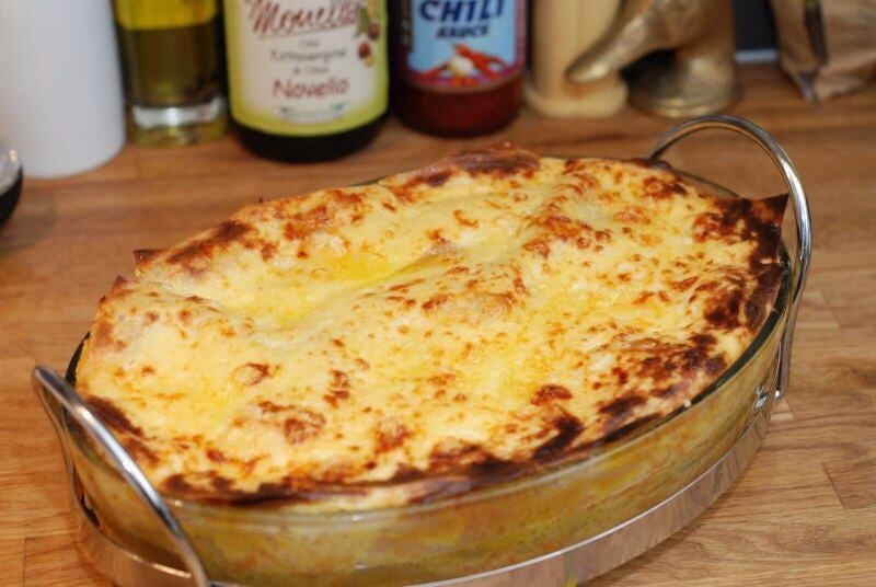 Coloque capas de la mezcla de zanahoria y lasaña en un plato engrasado, comenzando con un tercio de la mezcla de zanahoria y agregue tres capas de cada una.