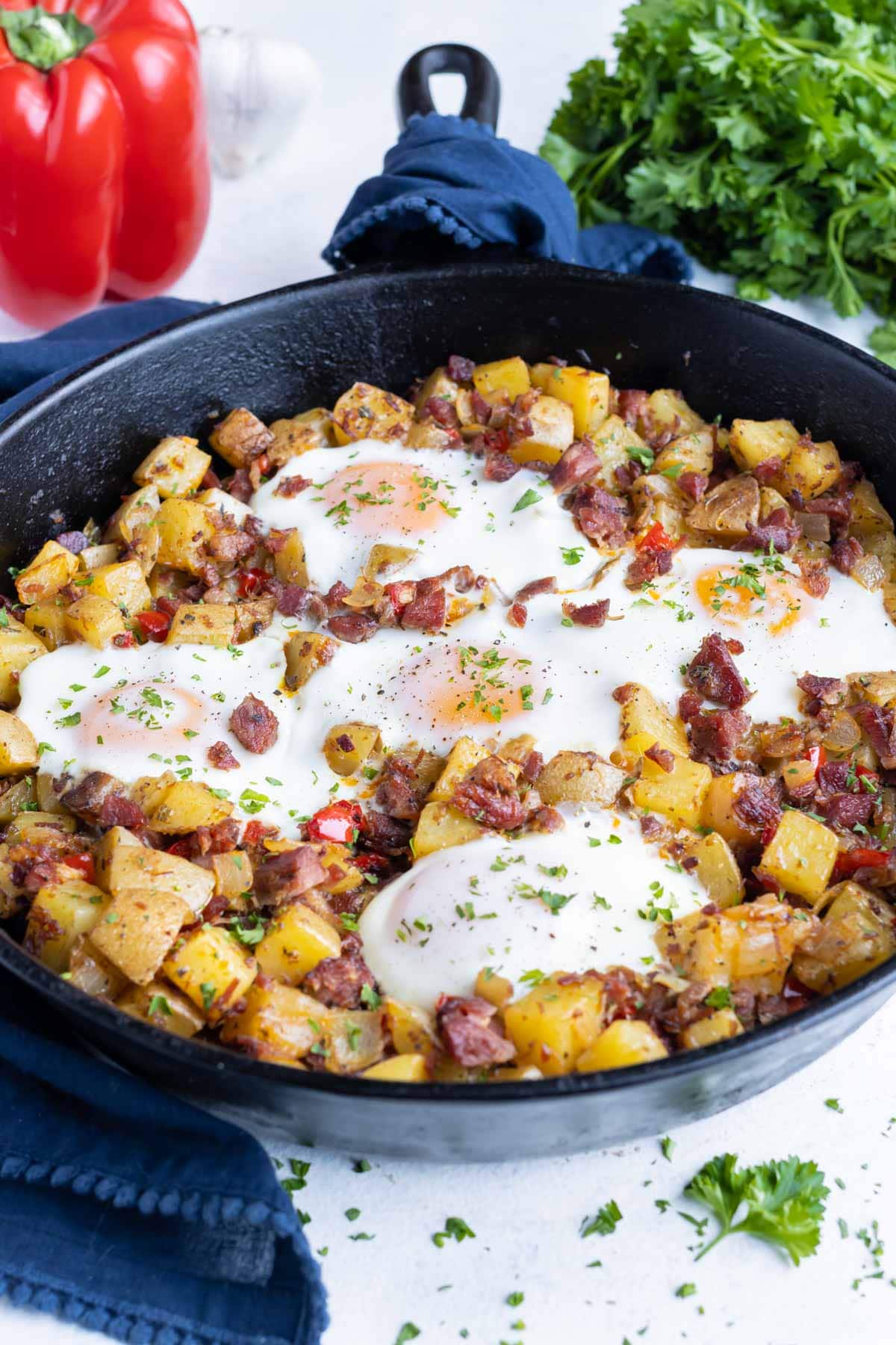 picadillo de carne en conserva ¡Es una receta clásica que se puede disfrutar para el desayuno, el brunch o la cena! La carne en conserva desmenuzada, las papas cortadas en cubitos y los huevos súper fáciles se combinan en una sartén de hierro fundido y saben mucho mejor que los enlatados. ¡Satisfaga sus antojos de comida irlandesa este Día de San Patricio o cualquier día del año!
