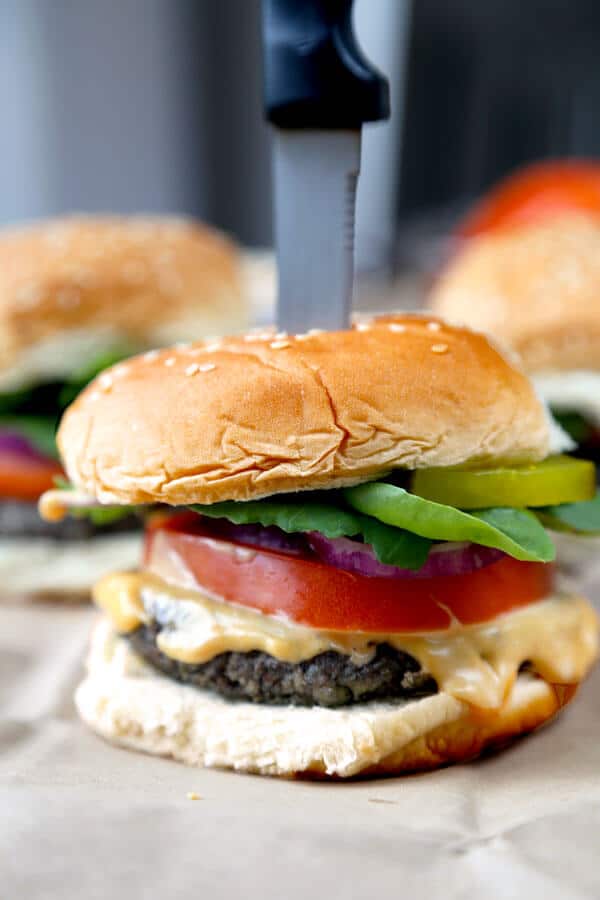 También pensé que si estaba tratando de hacer una deliciosa hamburguesa vegetariana, ¿por qué no hacerla completamente vegana? Me preocupaba un poco que la mezcla agria no se pegara, pero resultó ser incluso mejor de lo que esperaba.