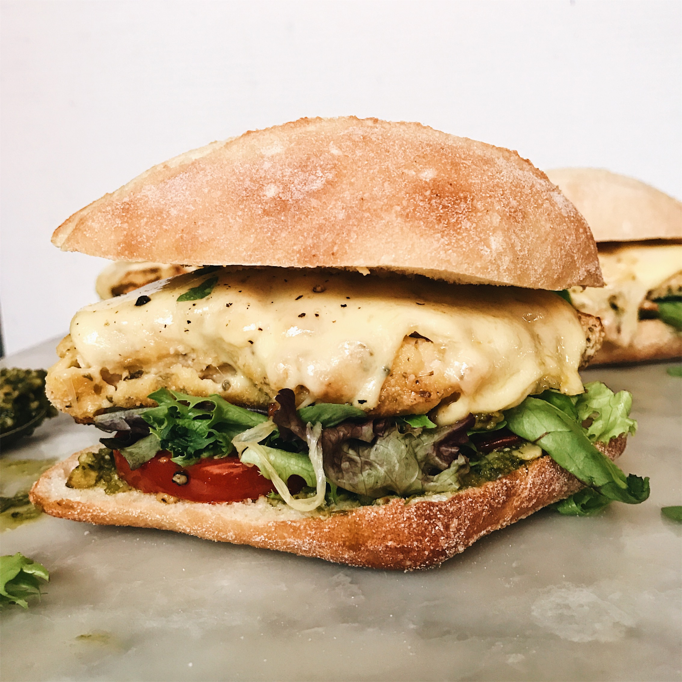Mi marca particular de productos maravillosos hoy tiene que ver con las hamburguesas, así que basta de divagaciones, hablemos de esta bondad cursi. Esta hamburguesa es pollo a la parma, pero en racha. es glorioso Una capa de delicioso pesto en el fondo, luego rodajas de tomate asado encima. Seguido de pollo dorado desmenuzado, cubierto con mozzarella derretida y un puñado de verduras mixtas para agregar a la mezcla. Y esta miga. Esa miga es la perfección. Cubrí este pollo dos veces para asegurarme de obtener esa textura crujiente en cada bocado. La miga es una mezcla bien sazonada de harina de garbanzos y harina de almendras para que quede súper crujiente. El pollo cubierto se cocina para asegurar que los sesos no caigan en la sartén y luego se sella en la sartén con una capa ligera de aceite de oliva para terminar. Eso es todo lo que quiero en la vida en una hamburguesa. Sabor, textura y momentos divertidos. No puedes aprovecharte de esto. Yo prometo.