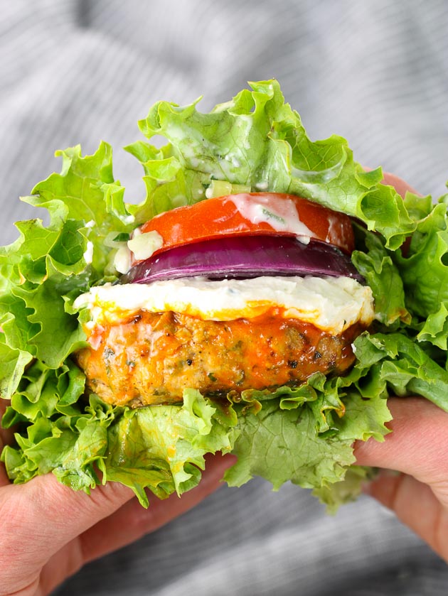 Hamburguesa de Pollo Búfalo con Salsa de Queso Azul… ¡una deliciosa creación servida en un wrap de lechuga, ensalada o tostadas! La hamburguesa y la salsa son bajas en carbohidratos, cetogénicas y obviamente sin gluten. Sin embargo, si los sirves, ¡estarás en Burger Nirvana!
