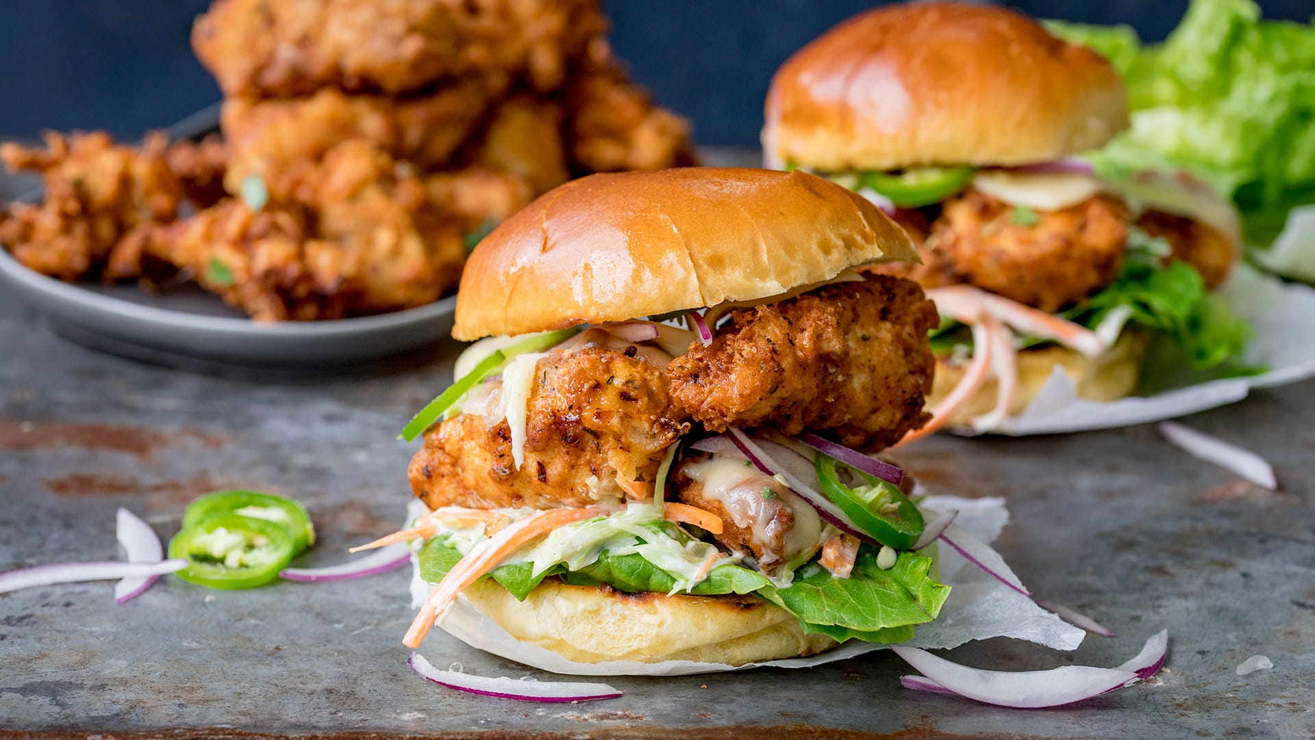 Hamburguesa de Pollo Crujiente con Ensalada de Col Miel y Mostaza en Pan Brioche Tostado, con Jalapeños y Lechuga Crujiente. ¡Mucho mejor que comida para llevar!