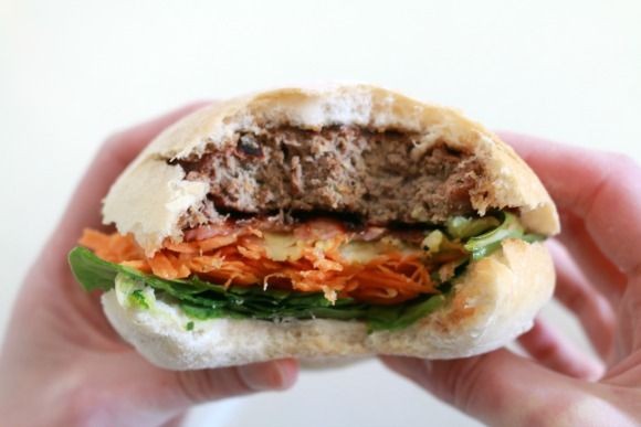 Sirva los bollos con 2 rebanadas de tocino, una hamburguesa de carne y los ingredientes de ensalada de su elección. Cubrir con la salsa barbacoa.