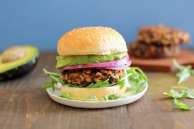 Puede hacer una acción de condimento de doble porción batiendo sobre una salsa de yogur con chipotle o un poco de guacamole, tal vez un poco de salsa o hummus… pan / sin pan, lechuga / sin lechuga… tomate / sin tomate. Todo tipo de opciones para esa hamburguesa tuya. Mantuve mis ingredientes simples con un poco de aguacate, cebolla roja y rúcula.