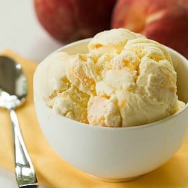 He combinado algunas recetas diferentes para unir esta, pero en su mayoría es un riff en mi receta favorita de helado de vainilla. Para acentuar la vainilla cremosa, marine los duraznos picados en azúcar y jugo de limón durante la noche, luego mezcle el jugo resultante con la base de crema antes de batir. Cuando el helado está casi congelado, se tiran todos los melocotones troceados. El dulce jugo de melocotón le da sabor al helado de una manera maravillosamente sutil; Lo cual, junto con los trozos de durazno por todas partes, los hace parecer cucharas de verano en cada bocado.