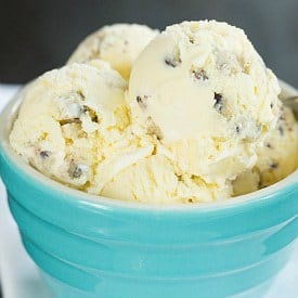 Porciones: 1 qt Preparación: 30 minutos Tiempo de congelación 8 horas 30 minutos Total: 9 horas Helado cremoso de vainilla cargado con trozos de masa para galletas con chispas de chocolate (sin huevos).