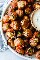 - Envuelva el tocino alrededor de las coles de Bruselas:Corta el tocino por la mitad y envuelve cada col de Bruselas con el tocino y asegúralo con un palillo. Colóquelos en la bandeja para hornear.