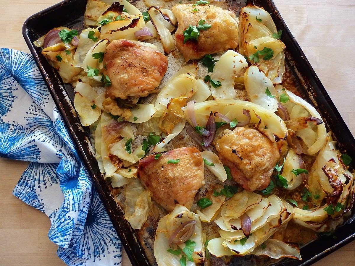 Vierta 1 cucharada de aceite en una fuente para horno. Coloque las piernas de pollo de manera uniforme en la bandeja para hornear preparada, sazone con 1/2 cucharadita de sal y pimienta al gusto y rocíe con otra cucharada de aceite. Hornea el pollo durante 15 minutos. Retire la sartén del horno y coloque el repollo, la cebolla roja y las rodajas de manzana alrededor del pollo. Sazone el repollo, la cebolla roja y las rodajas de manzana con la 1/2 cucharadita restante de sal y pimienta al gusto y rocíe con la 1 cucharada restante de aceite. Regrese la sartén al horno y cocine por otros 20 minutos, hasta que el pollo esté dorado y bien cocido.
