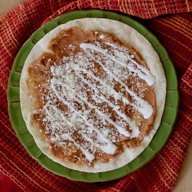 Coloca la tortilla en un plato. Distribuya los frijoles fritos.