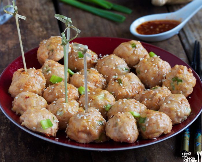¡Estas albóndigas de pollo serían el aperitivo perfecto y saludable del Superbowl o… sírvelas con arroz de coliflor con una guarnición de verduras fritas y tendrás una cena agradable, rápida y fácil!