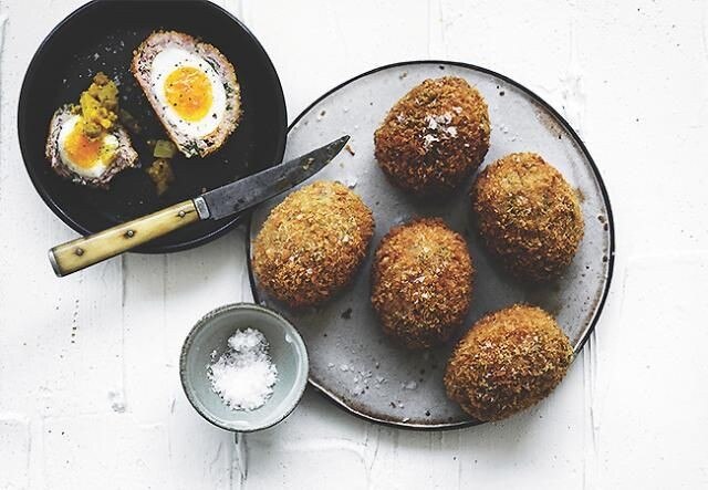 Caliente el aceite vegetal a 180 grados centígrados en una freidora o sartén grande. Freír los huevos en lotes durante 3-4 minutos hasta que estén dorados. Retirar con una espumadera, sazonar con sal y colocar sobre una rejilla. Ponga la parrilla en el horno durante 10 minutos. Retire del horno y sirva de inmediato si desea asegurarse de que la yema de huevo esté perfectamente líquida. Los huevos escoceses también se pueden disfrutar fríos. De todos modos, combinan perfectamente con unas cucharadas de nuestro Piccalili.