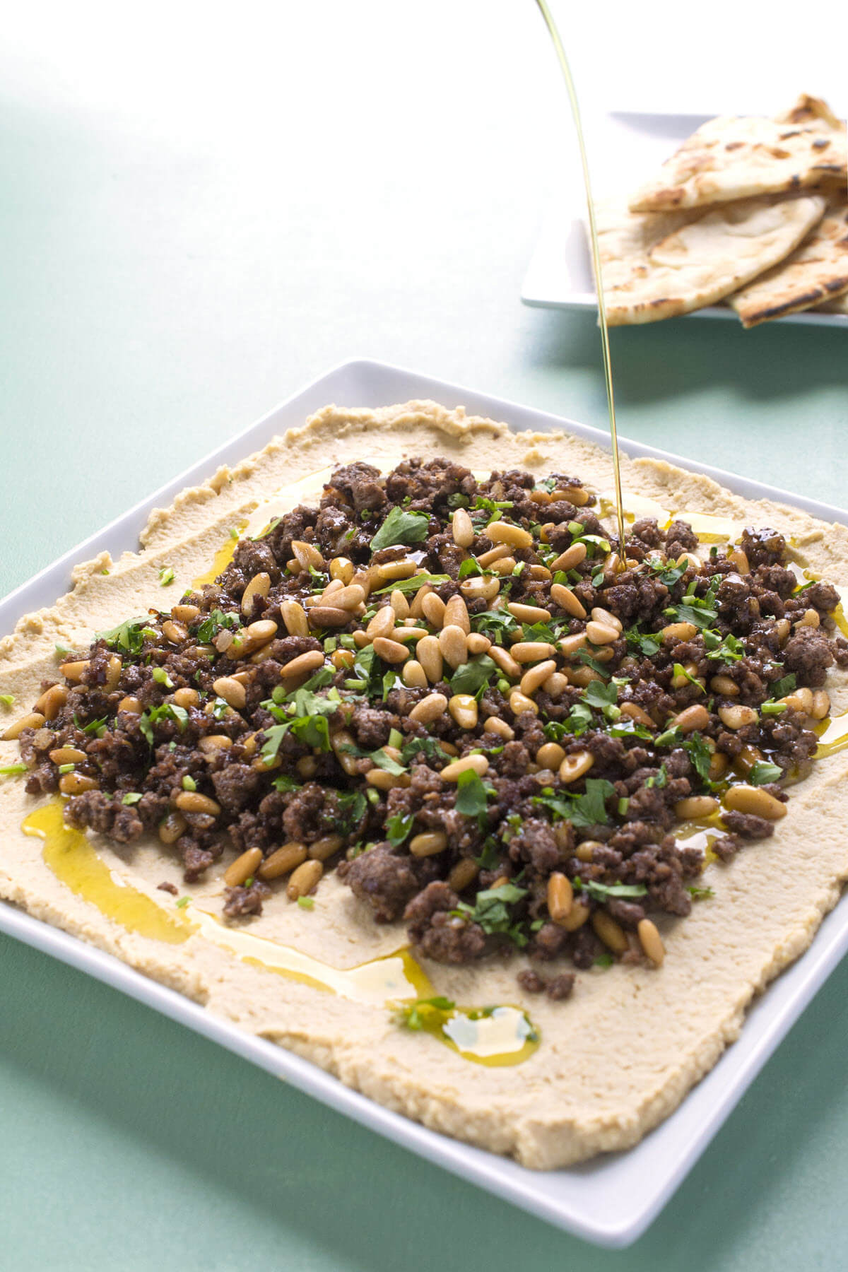 - Extienda la mezcla tibia de cordero y piñones sobre el hummus y espolvoree con perejil fresco. Sirva con pan de pita tibio para recoger.