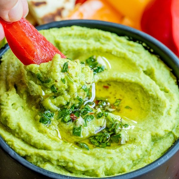 Avocado Hummus es una deliciosa mezcla de garbanzos y aguacate fresco que hace un dip saludable y sin gluten perfecto para fiestas o simplemente como un refrigerio por la tarde.