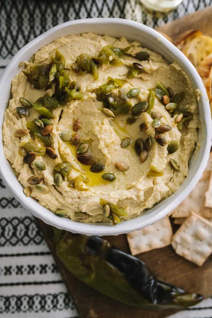 Esta receta fácil y picante de hummus de pimiento verde asado está hecha con puré de garbanzos, ajo, jugo de limón fresco, tahini, pimiento asado, aceite de oliva y pepitas tostadas para decorar. Este toque mexicano casero en hummus clásico es fresco, saludable, cremoso, rico, picante y alto en proteínas.
